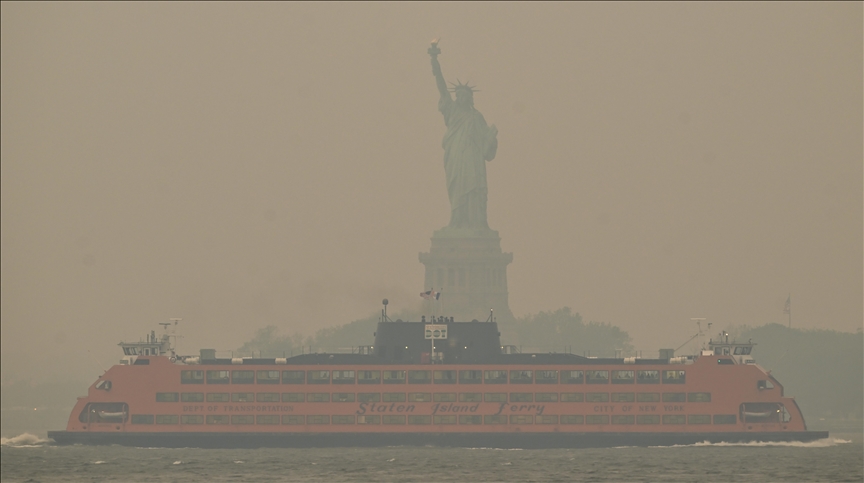 Images captured by Anadolu videographers and photographers show the city blanketed by an orangish haze, with typically prominent major landmarks such as the Empire State Building barely visible. The city's iconic skyline can barely be made out amid the gloomy conditions.