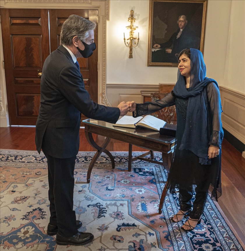 Facing the media, and meeting with US Secretary of State Antony Blinken in Washington D.C., the poised and newly married Yousafzai told Blinken: "You've mentioned that we're here to talk about equality in girls' education, but we know that Afghanistan right now is the only country where girls do not have access to secondary education."
