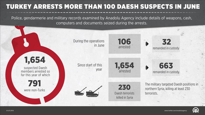 According to Interior Minister Efkan Ala on Thursday, 1,654 suspected Daesh members have been arrested so far this year of which 791 were non-Turks. Of those arrested, 663 were remanded in custody.
