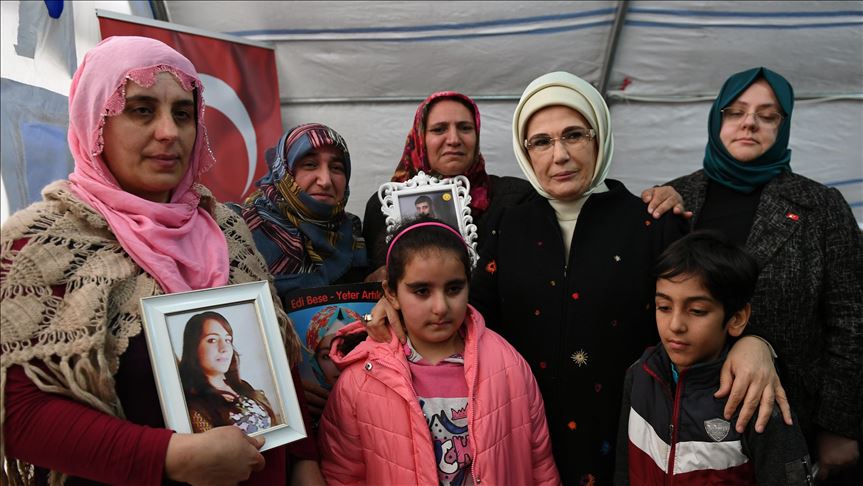 "I believe with all my heart that the power of motherly love will defeat terrorism, weapons, and oppression," Emine Erdogan said during a visit to Diyarbakir province in support to mothers whose children were kidnapped the terrorist group YPG/PKK.