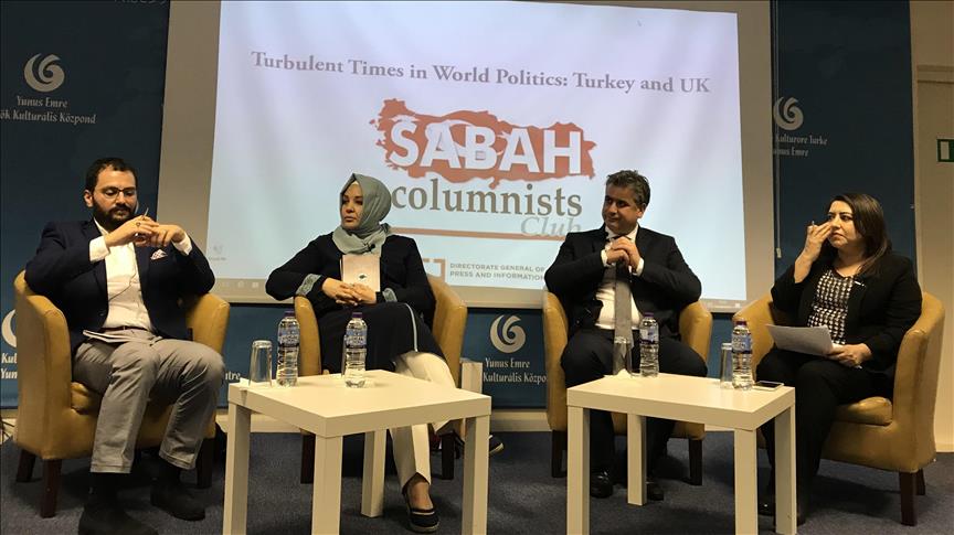 The panel, titled "Turbulent Times in World Politics: Turkey and UK", was held at the Yunus Emre Institute and organized by the Sabah Columnists Club.