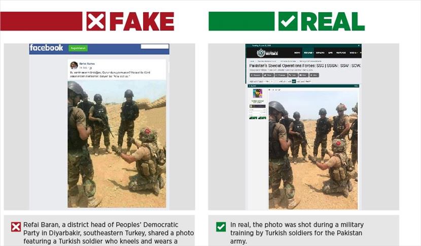 Refai Baran, HDP's district head of Bismil in southeastern province of Diyarbakir, shared a distorted photo of a kneeling Turkish soldier who is wearing his helmet with Turkish flag figure on it, along with a manipulating text in his social media account, as if the photo was taken during Turkey's anti-terror Operation Peace Spring.