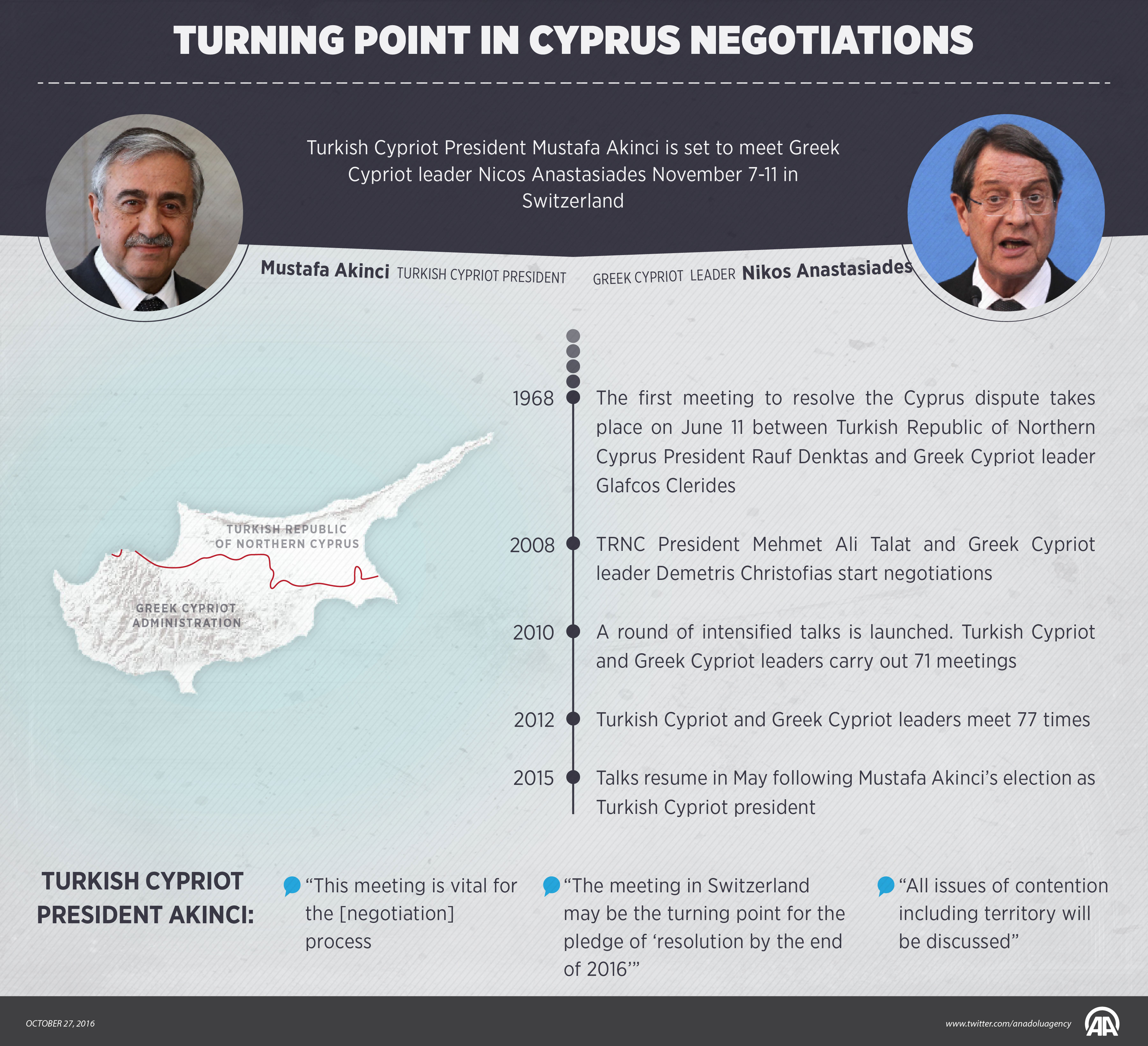 Turkish Republic of Norther Cyprus President Mustafa Akinci and Greek Cypriot leader Nicos Anastasiades are expected to discuss the issue of territory for the first time in Switzerland