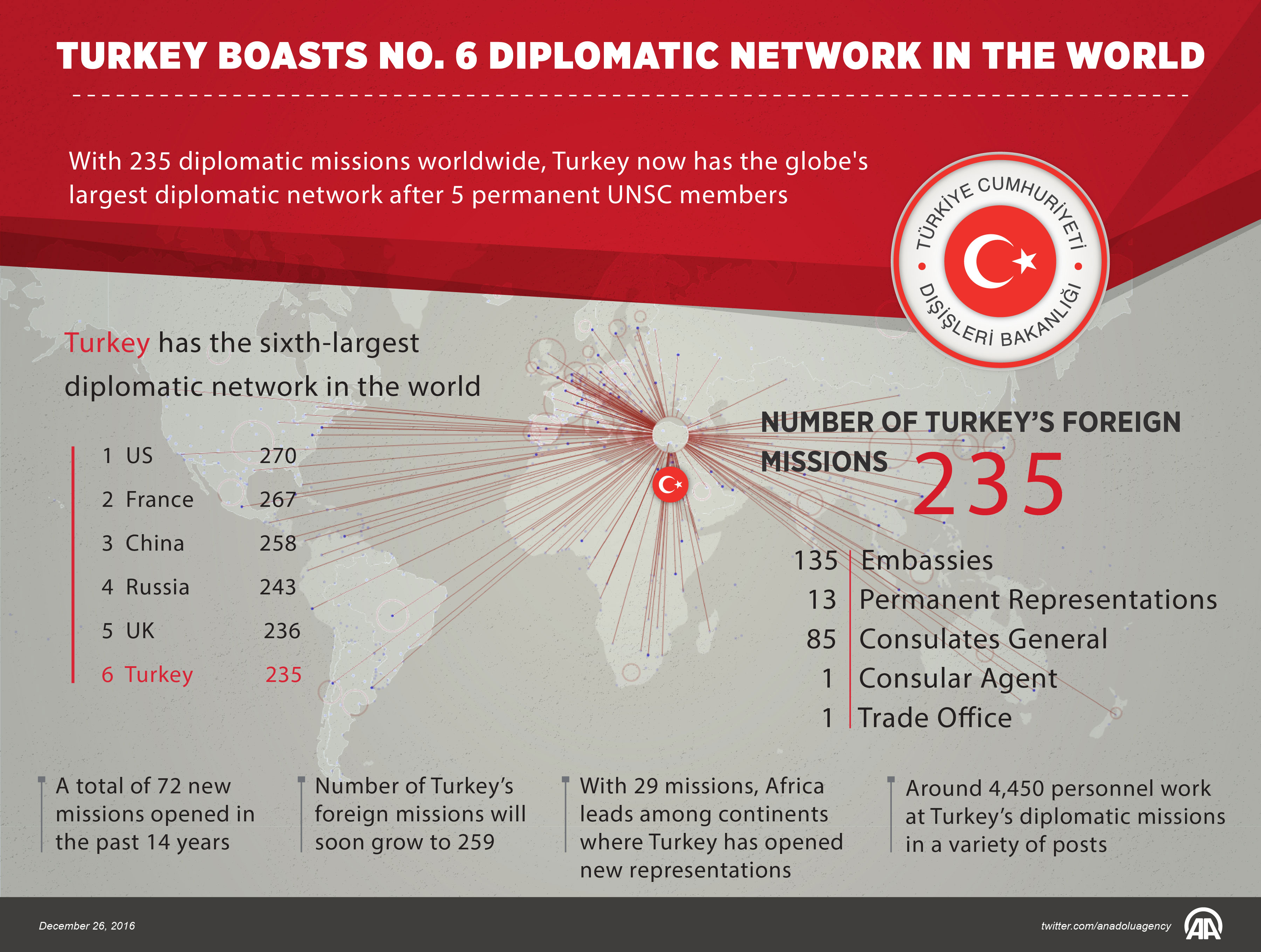 With 235 diplomatic missions worldwide, Turkey now has globe's largest diplomatic network after 5 permanent UNSC members
