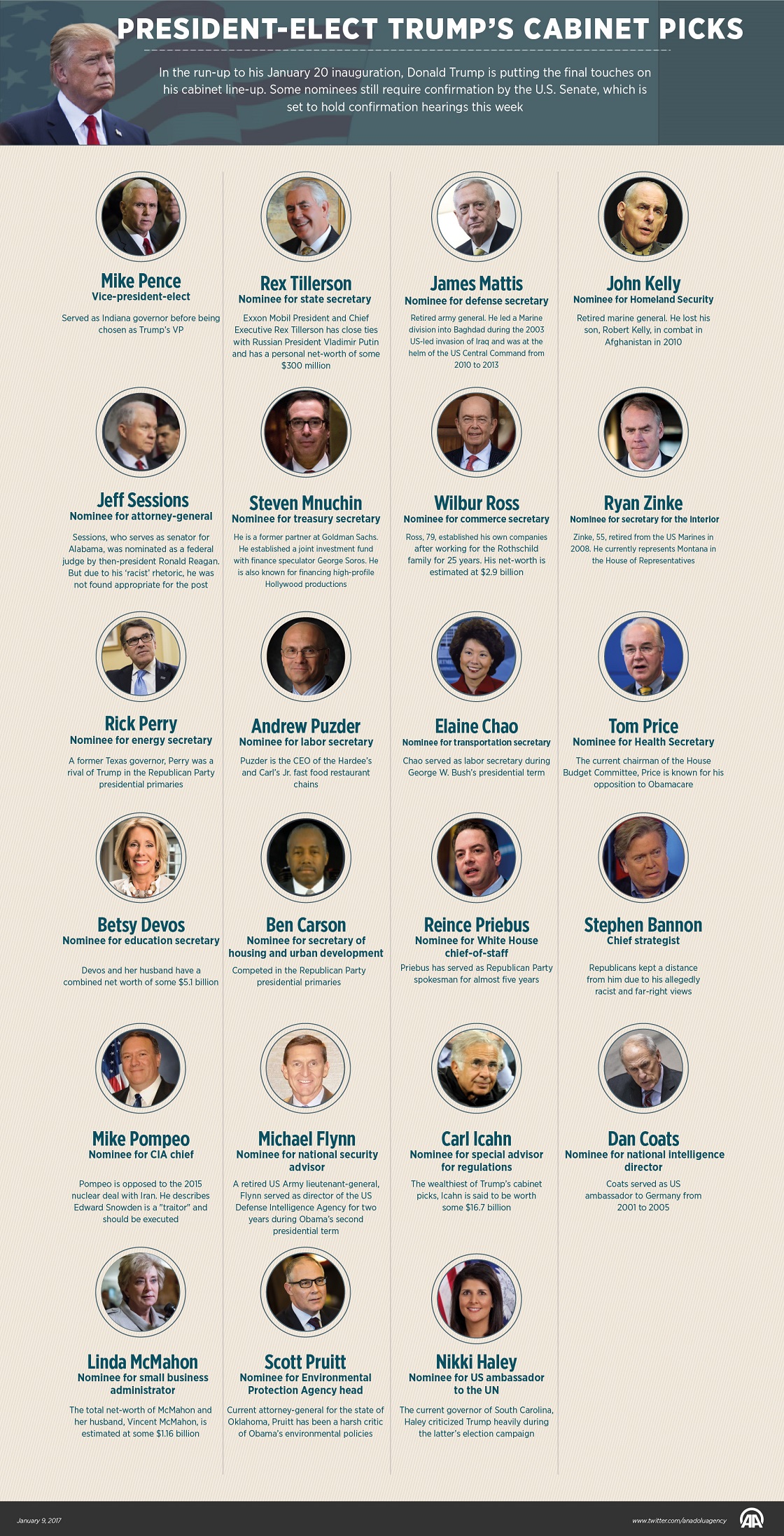 In the run-up to his January 20 inauguration, Donald Trump is putting the final touches on his cabinet line-up. Some nominees still require confirmation by the U.S. Senate, which is set to hold confirmation hearings this week