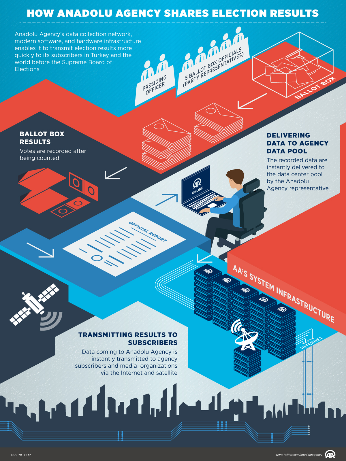 Anadolu Agency’s data collection network, modern software, and hardware infrastructure enables it to transmit election results more quickly to its subscribers in Turkey and the world before the Supreme Board of Elections 19 April 2017•Update: 19 April 2017