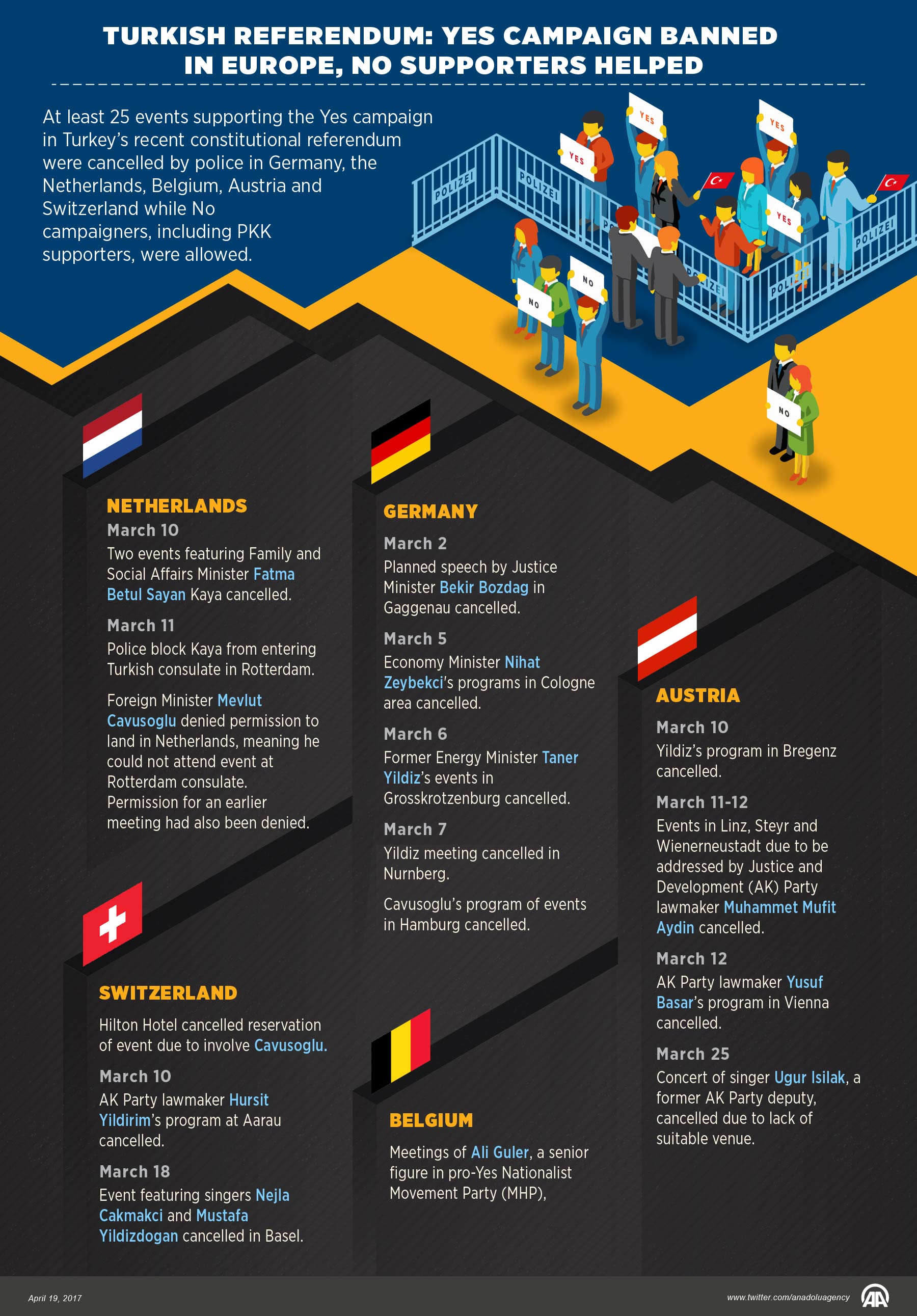At least 25 events supporting the Yes campaign in Turkey’s recent constitutional referendum were cancelled by police in Germany, the Netherlands, Belgium, Austria and Switzerland while No campaigners, including PKK supporters, were allowed.19 April 2017•Update: 19 April 2017
