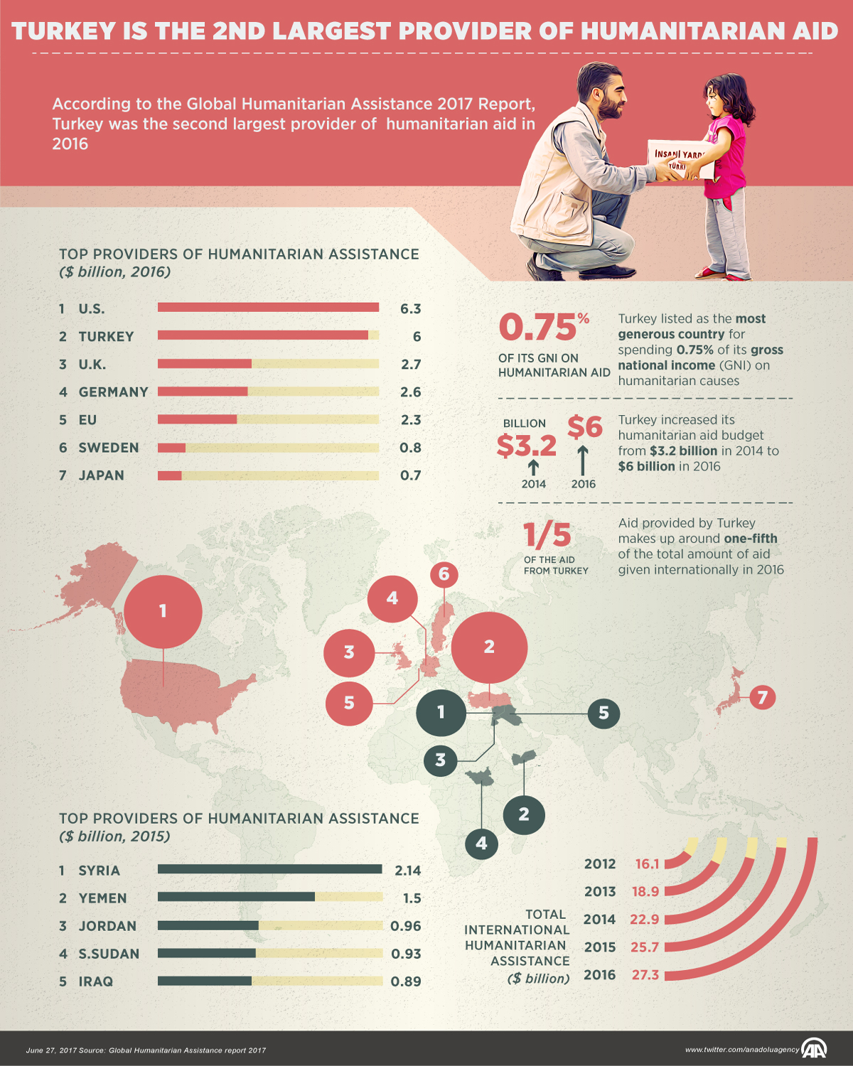 According to the Global Humanitarian Assistance 2017 Report, Turkey was the second largest provider of humanitarian aid in 2016