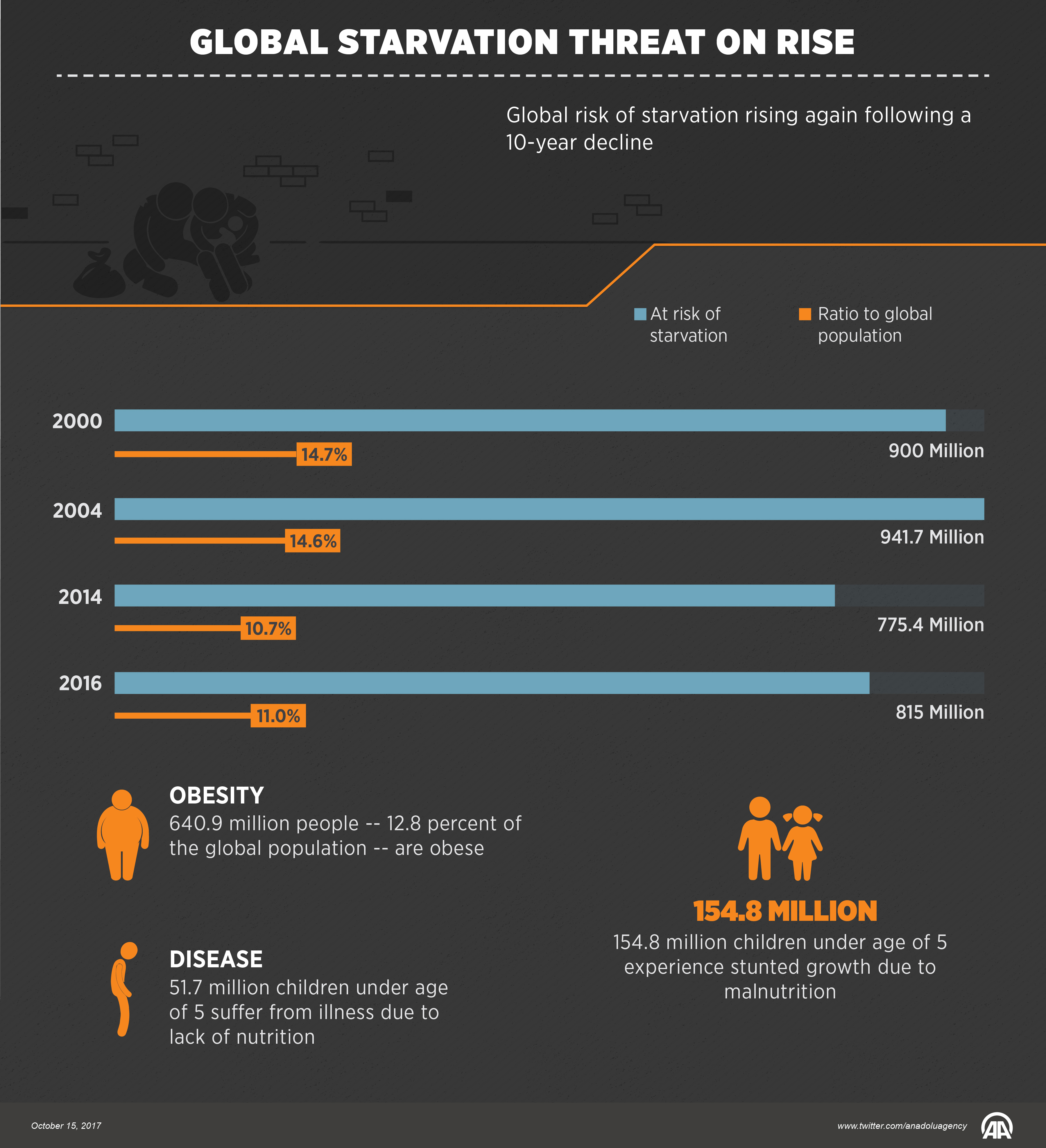 In the report titled “The State of Food Security and Nutrition In The World” that was released mid-September, the UN body said: “The estimated number of undernourished people increased to 815 million in 2016, up from 777 million in 2015.” 16 October 2017•Update: 16 October 2017