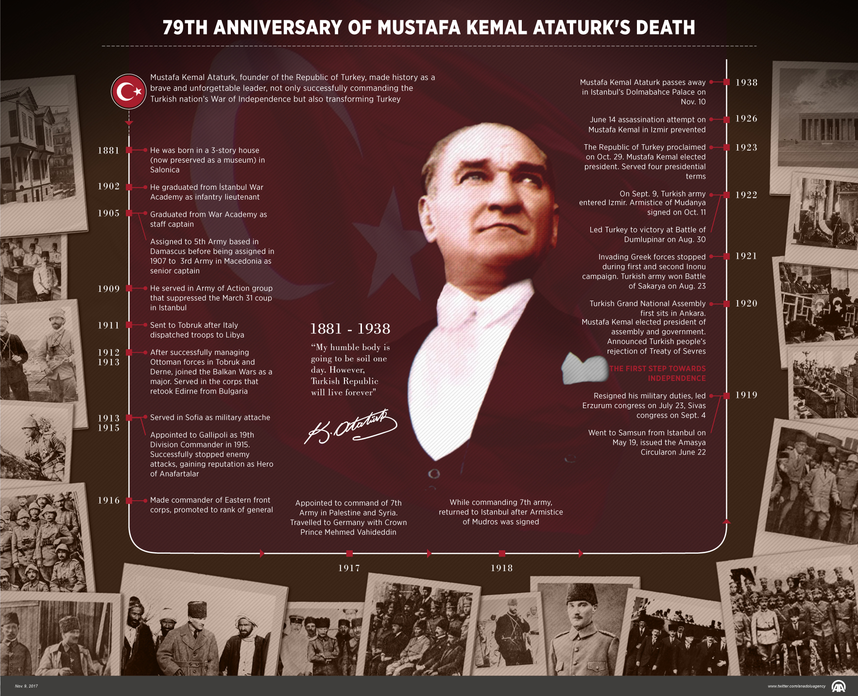 Mustafa Kemal Ataturk, founder of the Republic of Turkey, made history as a brave and unforgettable leader, not only successfully commanding the Turkish nation’s War of Independence but also transforming Turkey09 November 2017•Update: 09 November 2017