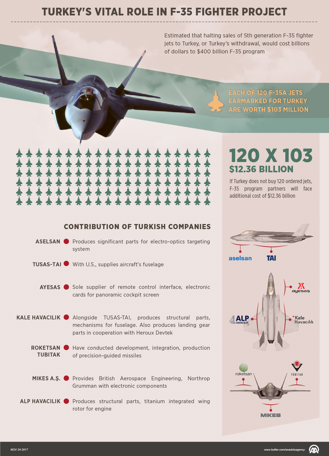 Estimated that halting sales of 5th generation F-35 fighter jets to Turkey, or Turkey’s withdrawal, would cost billions of dollars to $400 billion F-35 program