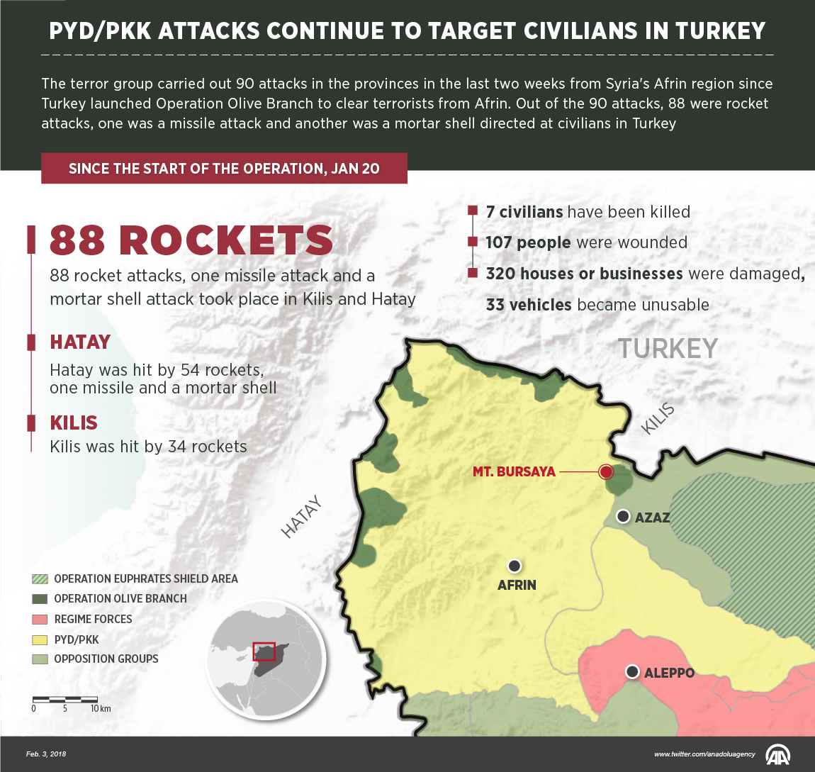 In last 2 weeks, 7 civilians have been killed in 90 attacks by PYD/PKK terror group on Turkey's Kilis, Hatay provinces