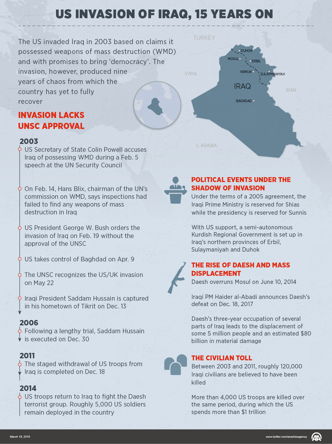 The US invaded Iraq in 2003 based on claims it possessed weapons of mass destruction (WMD) and with promises to bring ‘democracy’. The invasion, however, produced nine years of chaos from which the country has yet to fully recover19 March 2018•Update: 19 March 2018