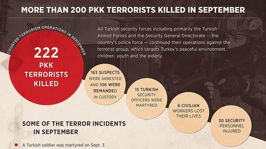 In September alone, 222 PKK terrorists were killed during the operations.