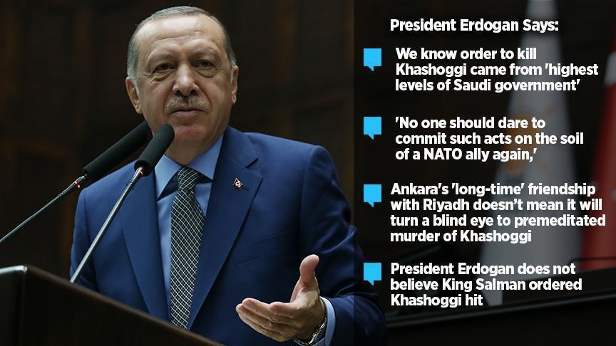 "We also know that those individuals came to carry out their orders: Kill Khashoggi and leave. Finally, we know that the order to kill Khashoggi came from the highest levels of the Saudi government," said Erdogan.