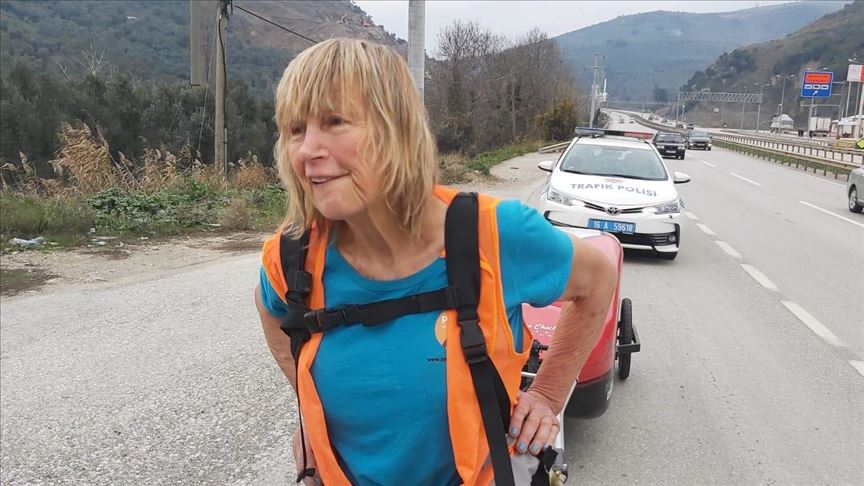 After setting out from Britain months ago, a septuagenarian runner raising money for charity made her distinctive mark in western Turkey on Monday.