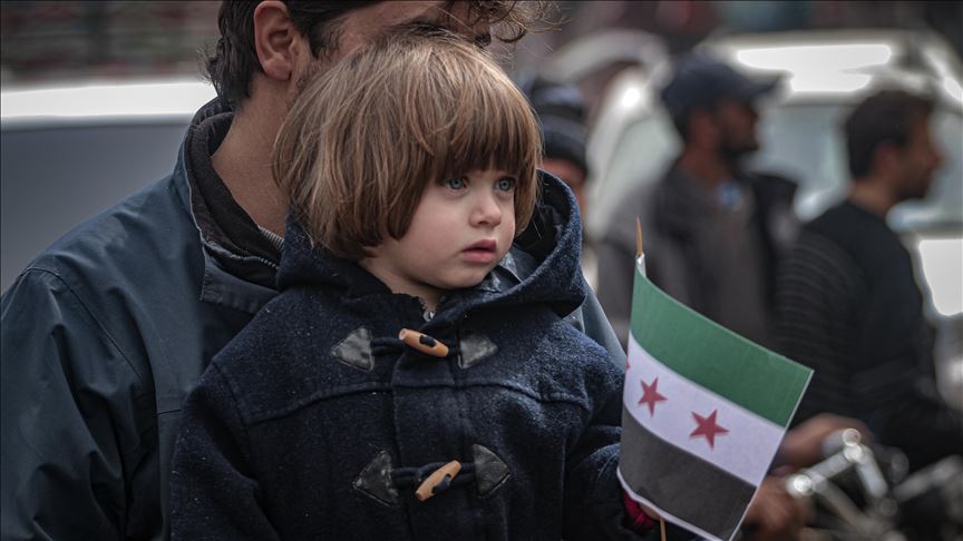 IDLIB, SYRIA - MARCH 06: A man holds a child during a support rally for Turkey following the ceasefire agreement between Turkey and Russia in Syria's Idlib on March 06, 2020. ( Muhammed Said - Anadolu Agency )