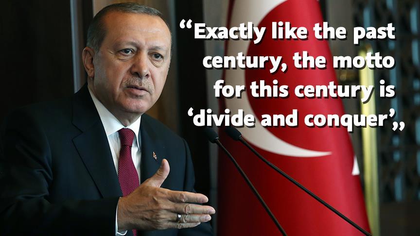 President Recep Tayyip Erdogan said on Thursday that global colonialist groups were deploying the “divide and conquer” strategy in the region.