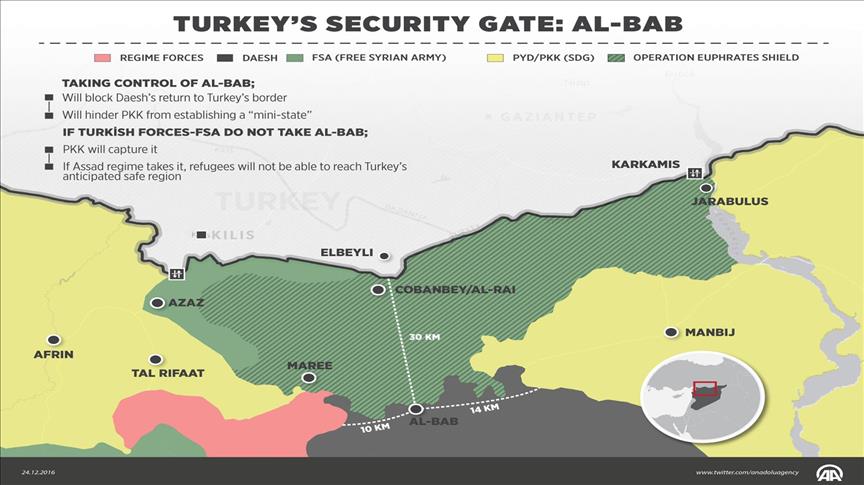Turkey has been seeking to liberate the Daesh-held town of Al-Bab in northern Syria and keep the PKK/PYD terrorists from its border with a view to maintaining border security and ensuing the safety of Syrian refugees.