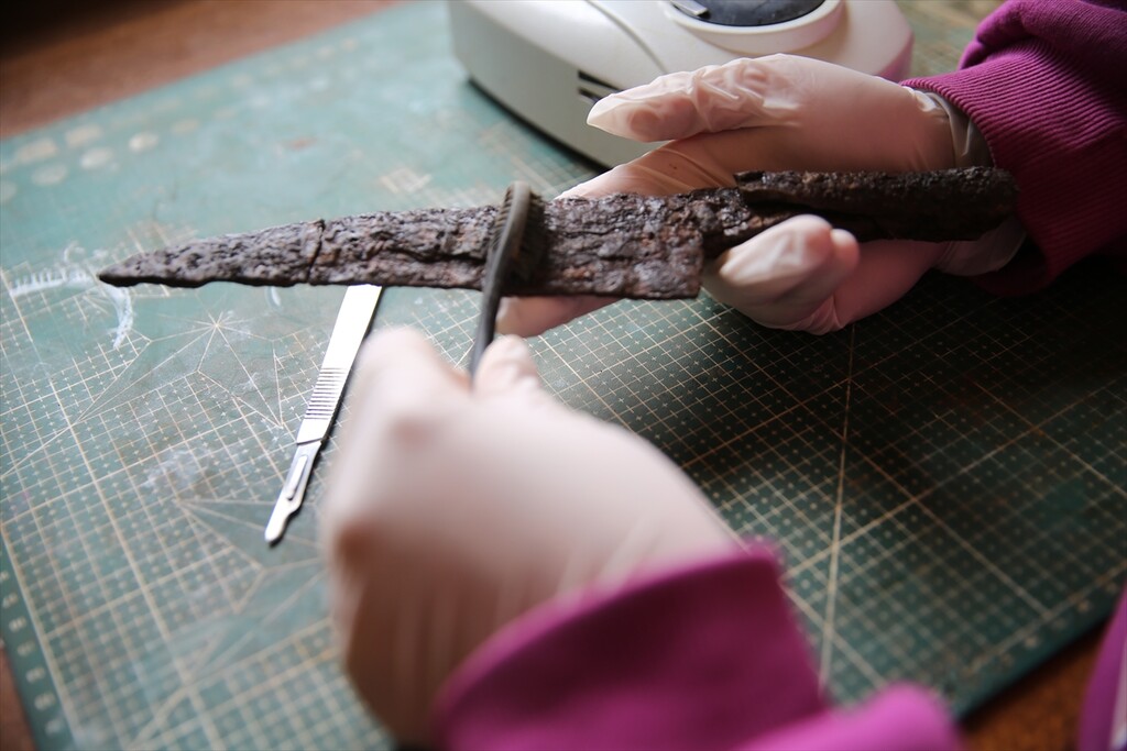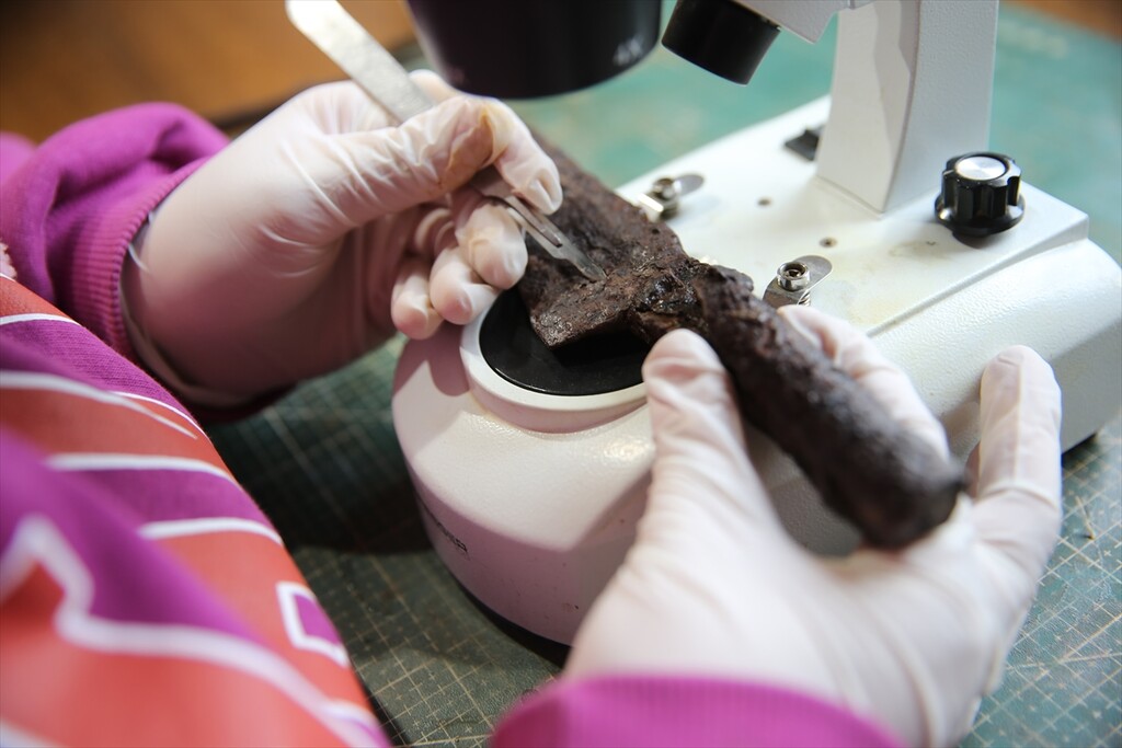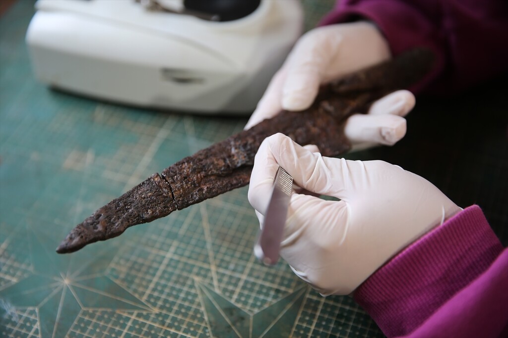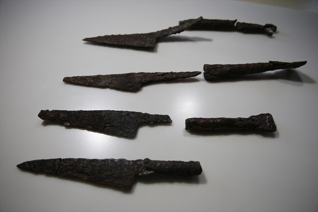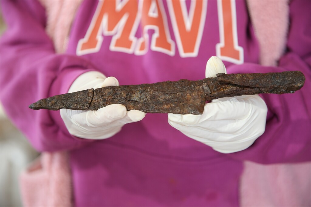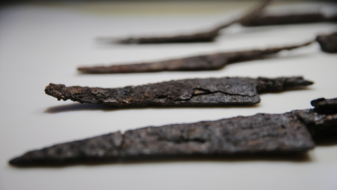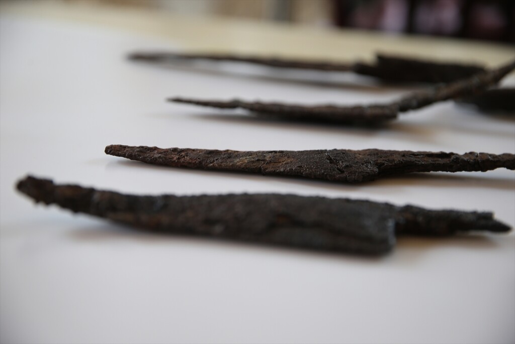Knives and a sharpening stone, known as a “kosure tasi,” believed to be around 1,500 years old are unearthed at the ancient city of Hadrianopolis in Eskipazar district of Karabuk, Türkiye, on October 11, 2025.