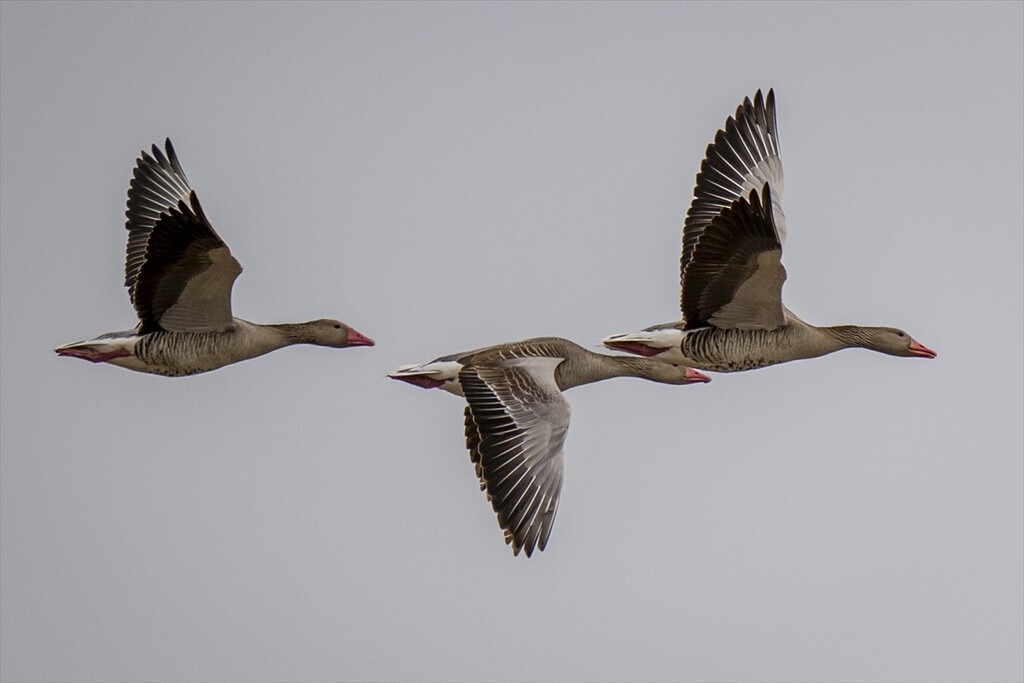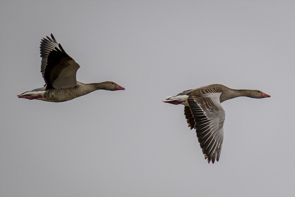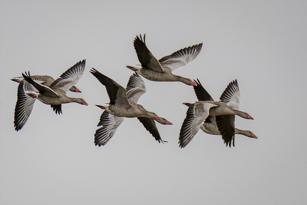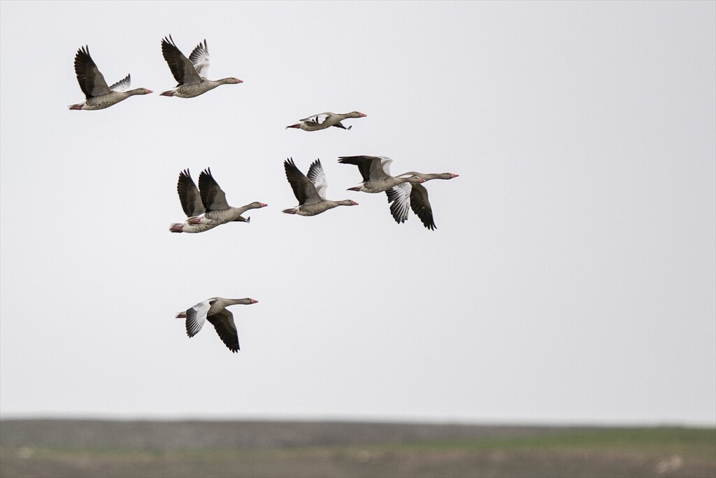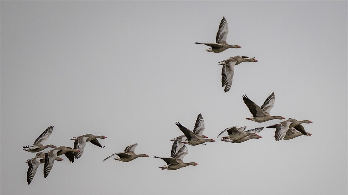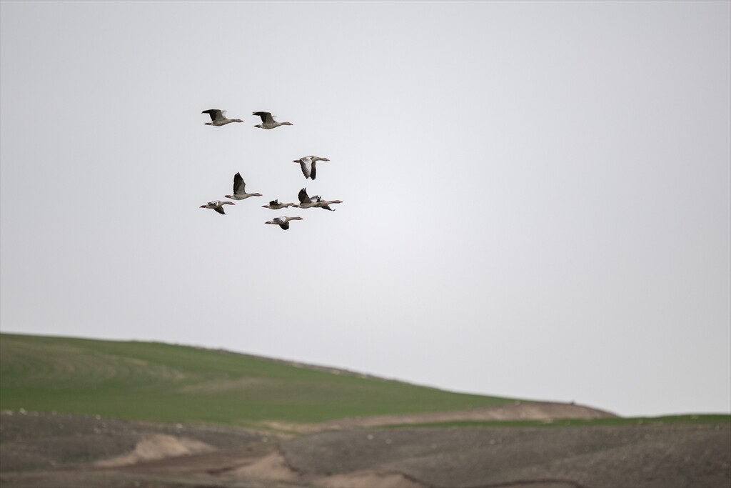 Grey geese, moving with the arrival of migration season, fly over the Cayir Stream in Golbasi district of Ankara, Turkiye on April 01, 2026. The ponds on Cayir Stream are home to numerous migratory birds of various species.