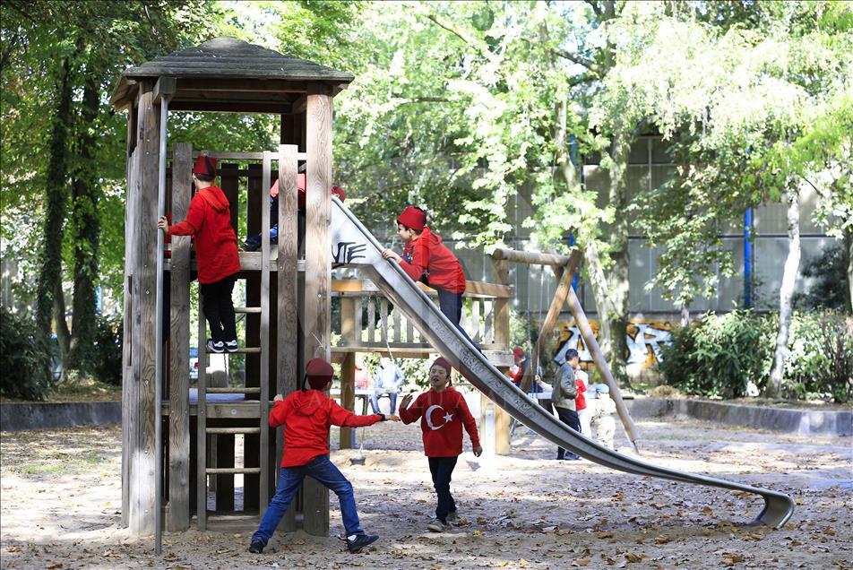 COLOGNE, GERMANY - SEPTEMBER 29: Children wearing Turkish Flag t-shirts are seen as people are gathering around the new Cologne Central Mosque which will be opened by Turkish President Recep Tayyip Erdogan in Cologne, Germany on September 29, 2018. ( Abdülhamid Hoşbaş - Anadolu Agency )Abdülhamid Hoşbaş