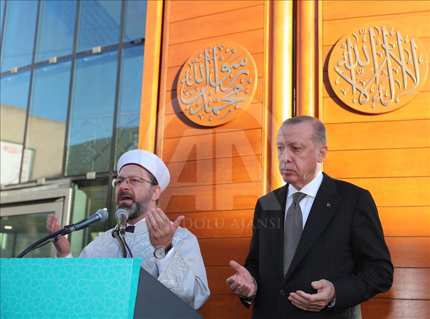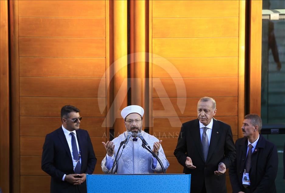 COLOGNE, GERMANY - SEPTEMBER 29: Turkish President Recep Tayyip Erdogan (R) stands next to the President of Religious Affairs of Turkey Ali Erbas (L) as he leads a pray during the opening ceremony of new Cologne Central Mosque in Cologne, Germany on September 29, 2018. ( Kayhan Özer - Anadolu Agency )Kayhan Özer