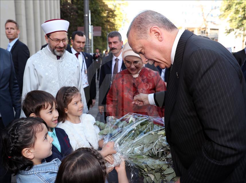 COLOGNE, GERMANY - SEPTEMBER 29: Turkish President Recep Tayyip Erdogan (R), his wife Emine Erdogan (right 2) and President of Religious Affairs of Turkey Ali Erbas (L) chat with kids during the opening ceremony of new Cologne Central Mosque in Cologne, Germany on September 29, 2018. ( Kayhan Özer - Anadolu Agency )Kayhan Özer