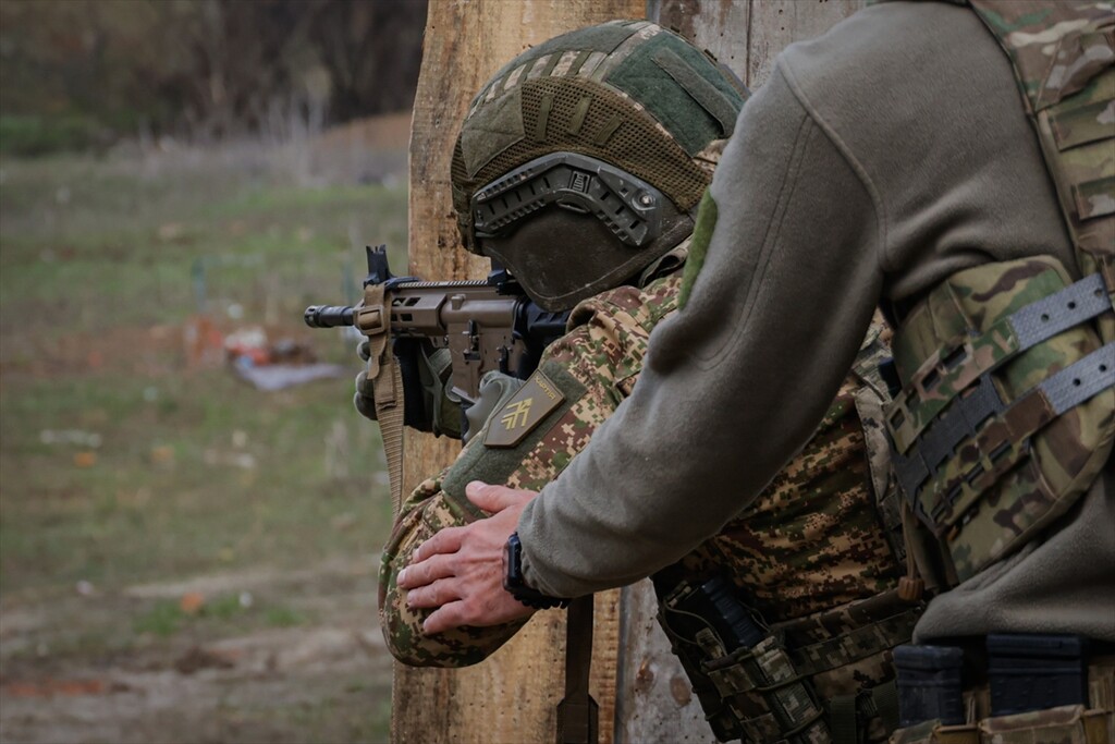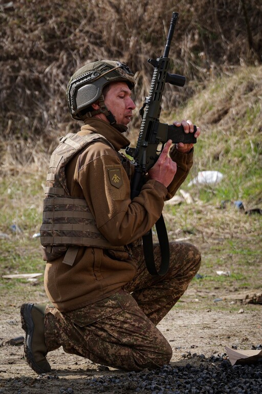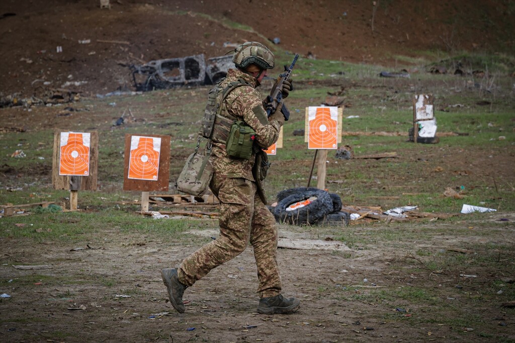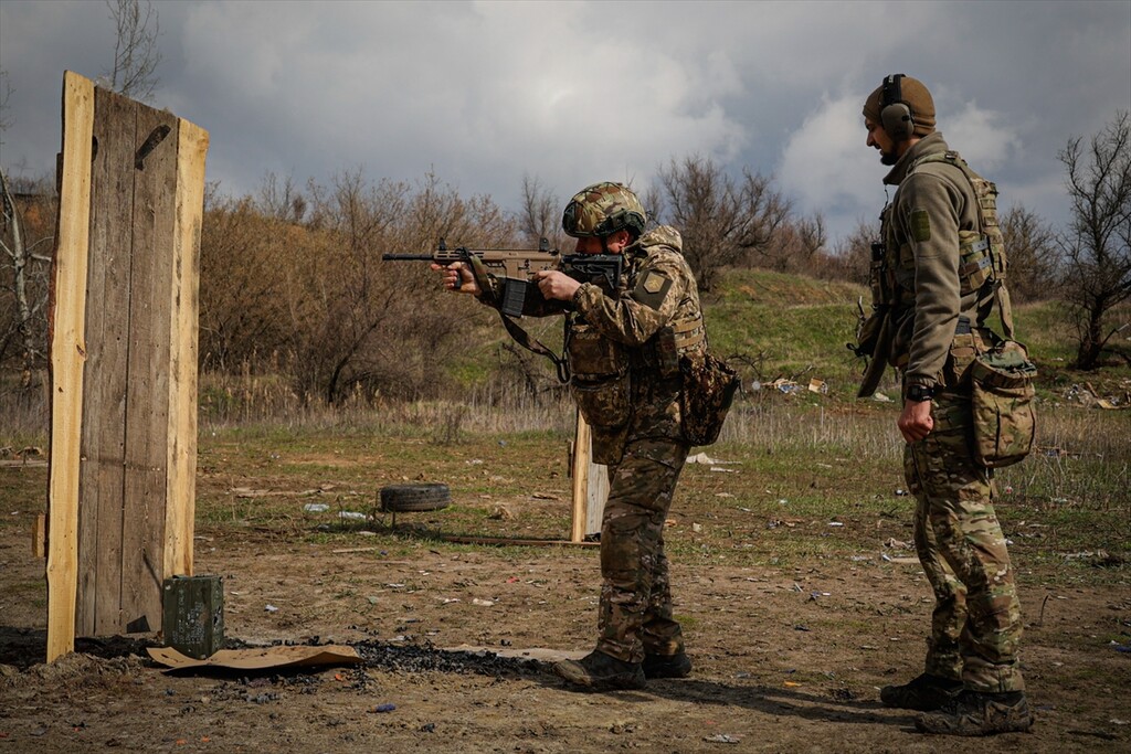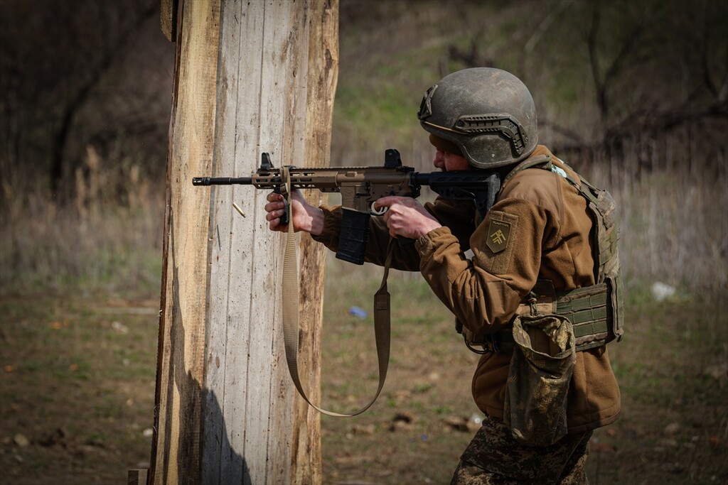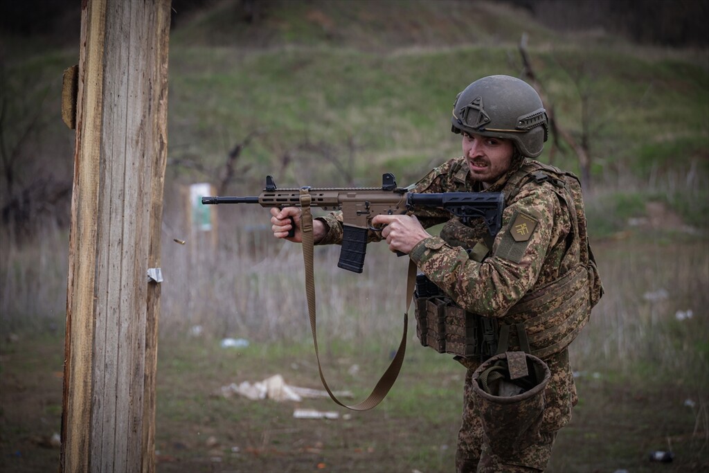Infantrymen of the 13th Operational Brigade of the National Guard of Ukraine "Khartiia" practice tactical techniques of firing from cover at a training ground in Kharkiv region, Ukraine on April 9, 2026.