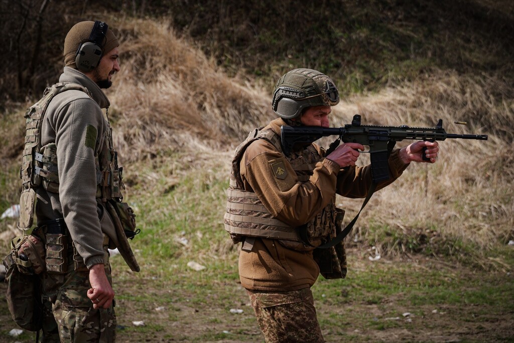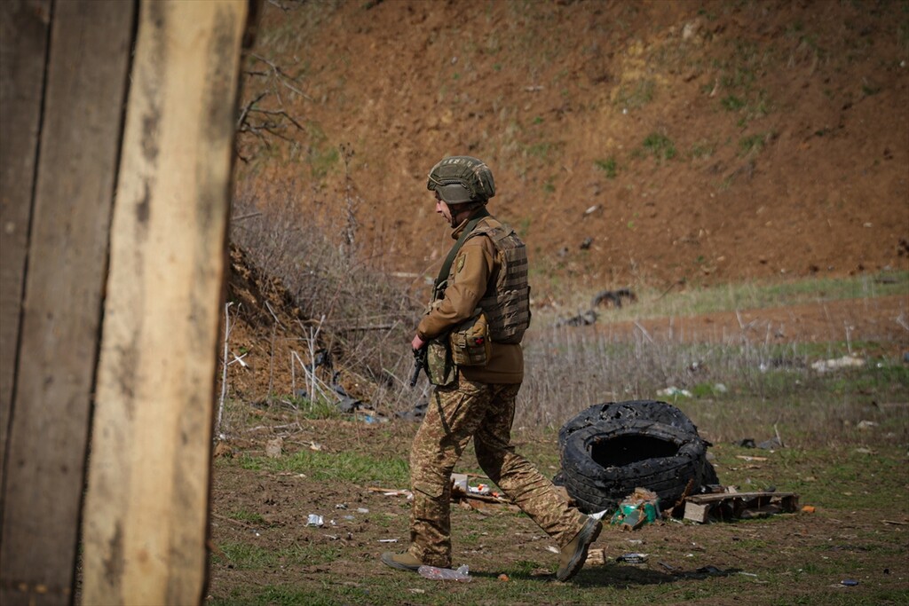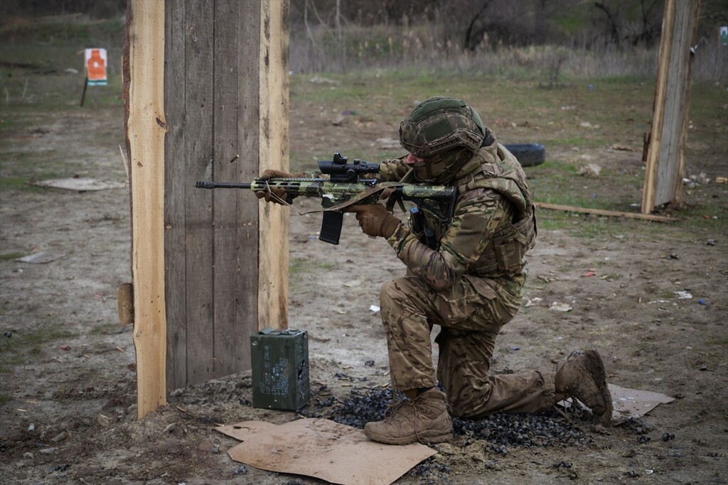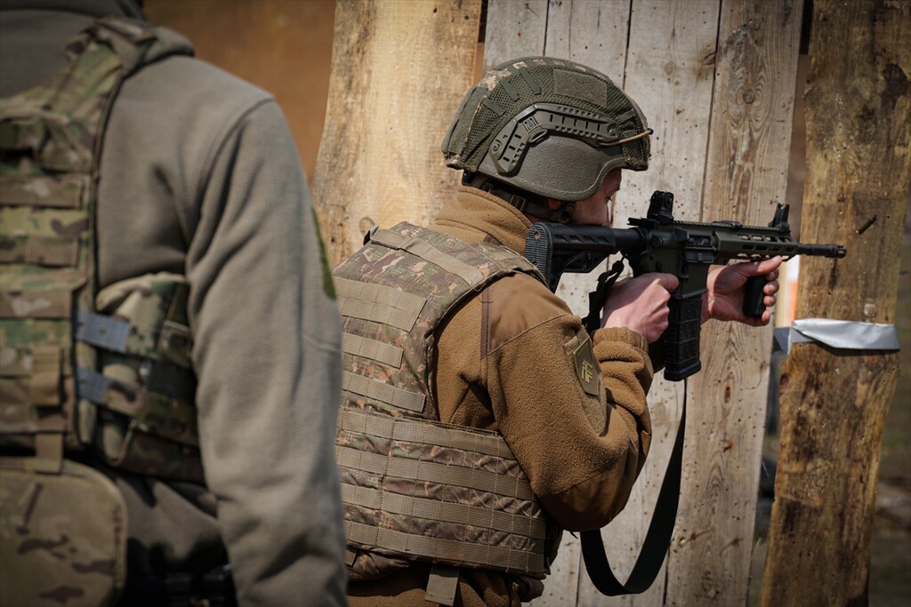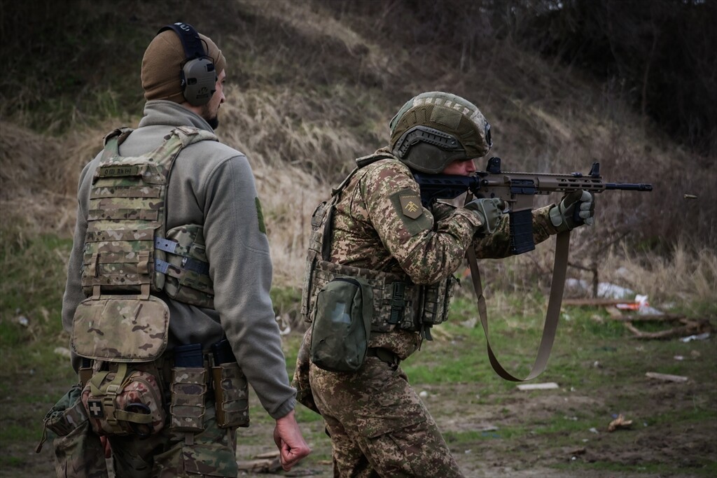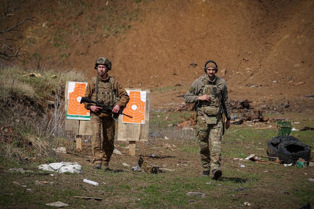 Infantrymen of the 13th Operational Brigade of the National Guard of Ukraine "Khartiia" practice tactical techniques of firing from cover at a training ground in Kharkiv region, Ukraine on April 9, 2026.