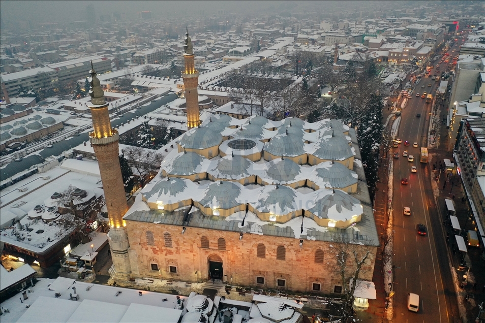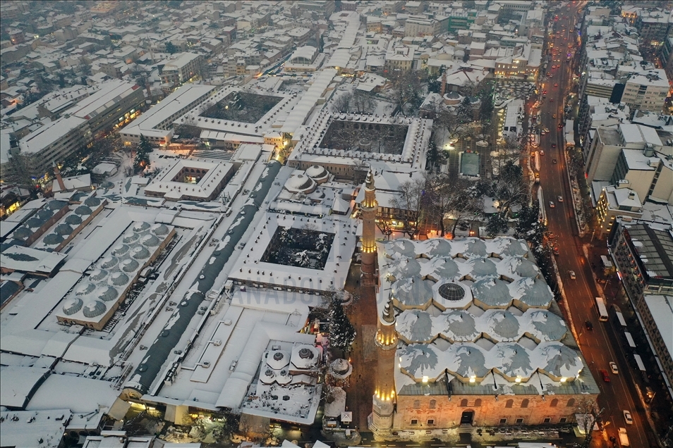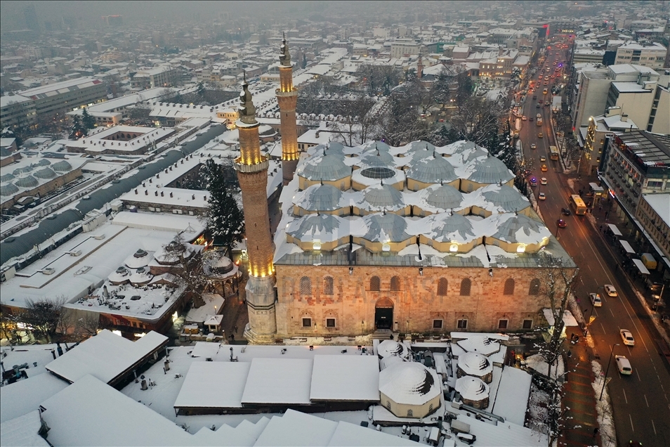 BURSA, TURKEY - JANUARY 21: A drone photo shows Grand Mosque of Bursa after snowfall in Bursa, Turkey on January 21, 2021. ( Ali Atmaca - Anadolu Agency )Ali Atmaca