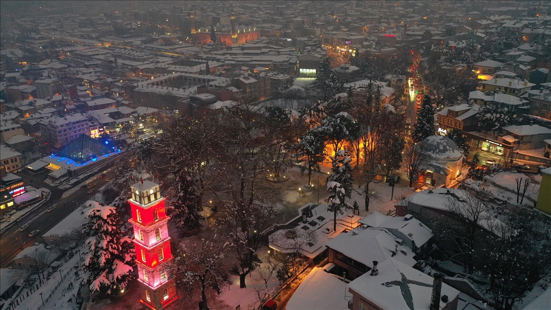 A drone photo shows Tophane Square, Osmangazi and Orhangazi shrines and clock tower after snowfall in Bursa, Turkey on January 21, 2021.