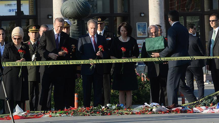Recep Tayyip Erdogan and Sauli Niinisto, who is on an official visit, held a minute’s silence and laid carnations in front of the train station where the twin bombings took place.