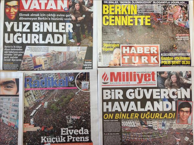 Turkish dailies on Thursday mainly cover the funeral of 15-year-old Gezi protests victim Berkin Elvan, who died on Tuesday after remaining in a coma for 269 days, and the European Parliament's (EP) 2013 progress report on Turkey.