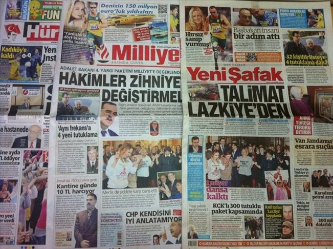 All of the Turkish dailies covered the February 14, Valentine's Day dance aimed to show global solidarity across the world on the issue of violence against women, celebrated in many countries and more than 20 Turkish cities. "Parliament also danced against violence" headlined daily MILLIYET referring to the female Turkish lawmakers who danced together at the parliament building in Ankara in support of the "One billion rising" campaign. "EU dance with Fuele" added daily MILLIYET in regards to Family and Social Policies Minister Fatma Sahin's dance with European Commissioner Stefan Fuele in Brussels to show their support for the event.