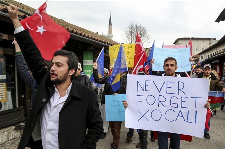 About 150 people gathered in the Gazi Husrev-beg Mosque in the capital Sarajevo after prayers and marched in the center of the city with the flags of Turkey and Bosnia and Herzegovina, carrying posters reading: "There is no genocide, there is Canakkale" and "Never Forget Khojaly".