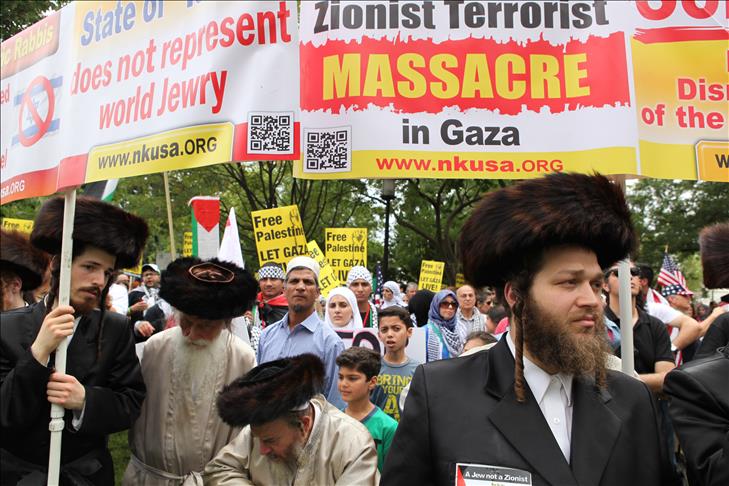 A group of orthodox Jews were among the demonstrators, carrying banners declaring: "Judaism rejects the Zionist Israeli State and its atrocities."