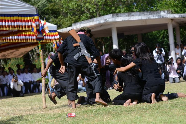 In an open grassy area adjacent to a towering stupa where the skulls and bones of thousands of victims are displayed, a troupe of actors in Khmer Rouge dress -- black tunics and pants, red ‘krama’ scarves and green caps -- depicted the horrors of the 1970s against a backdrop of mournful music and gunfire-like drums.