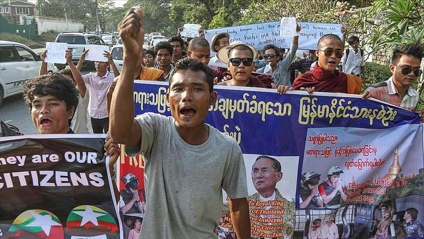 “We are demanding justice for our Myanmar nationals,” said Pamaukkha, abbot of Magway monastery in Yangon who organized Tuesday’s protest.