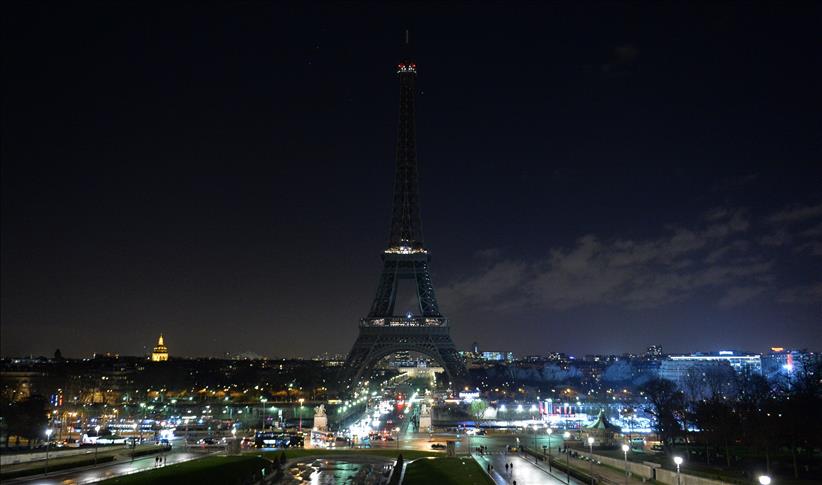 The lights on the 324-meter iconic Eiffel Tower went dark in memory of the 12 people shot and killed Wednesday.