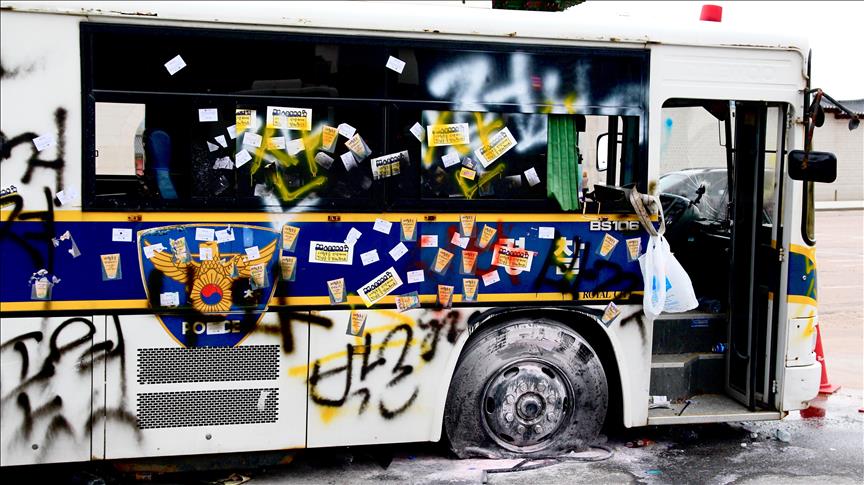 More than 70 police vehicles were damaged or even tipped over - some sprayed with graffiti slogans calling for President Park Geun-hye’s resignation.