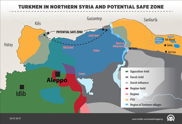 A potential safe zone that could be established in northern Syria between Azaz and Jarabulus will be effective in eliminating the Daesh pressure and Syrian Democratic Union Party (PYD) threat over Turkmen villages, Turkmen leaders say.