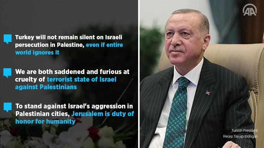 "Resisting (Israel's) aggression on Palestinian cities and Jerusalem is a debt of honor of all humanity," Erdogan added.