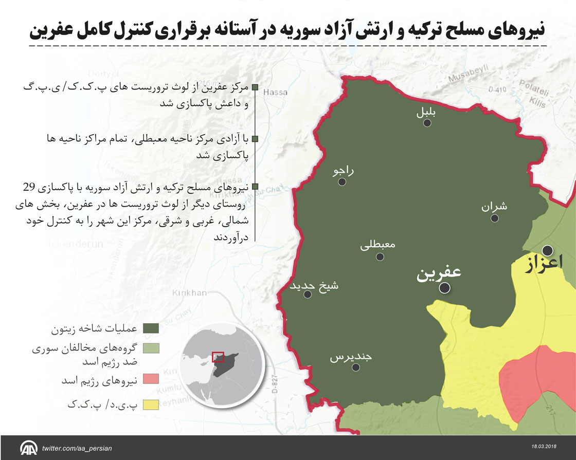 نیروهای مسلح ترکیه و ارتش آزاد سوریه با پاکسازی 29 روستای دیگر از لوث تروریست ها در عفرین، بخش های شمالی، غربی و شرقی، مرکز این شهر را به کنترل خود درآوردند.