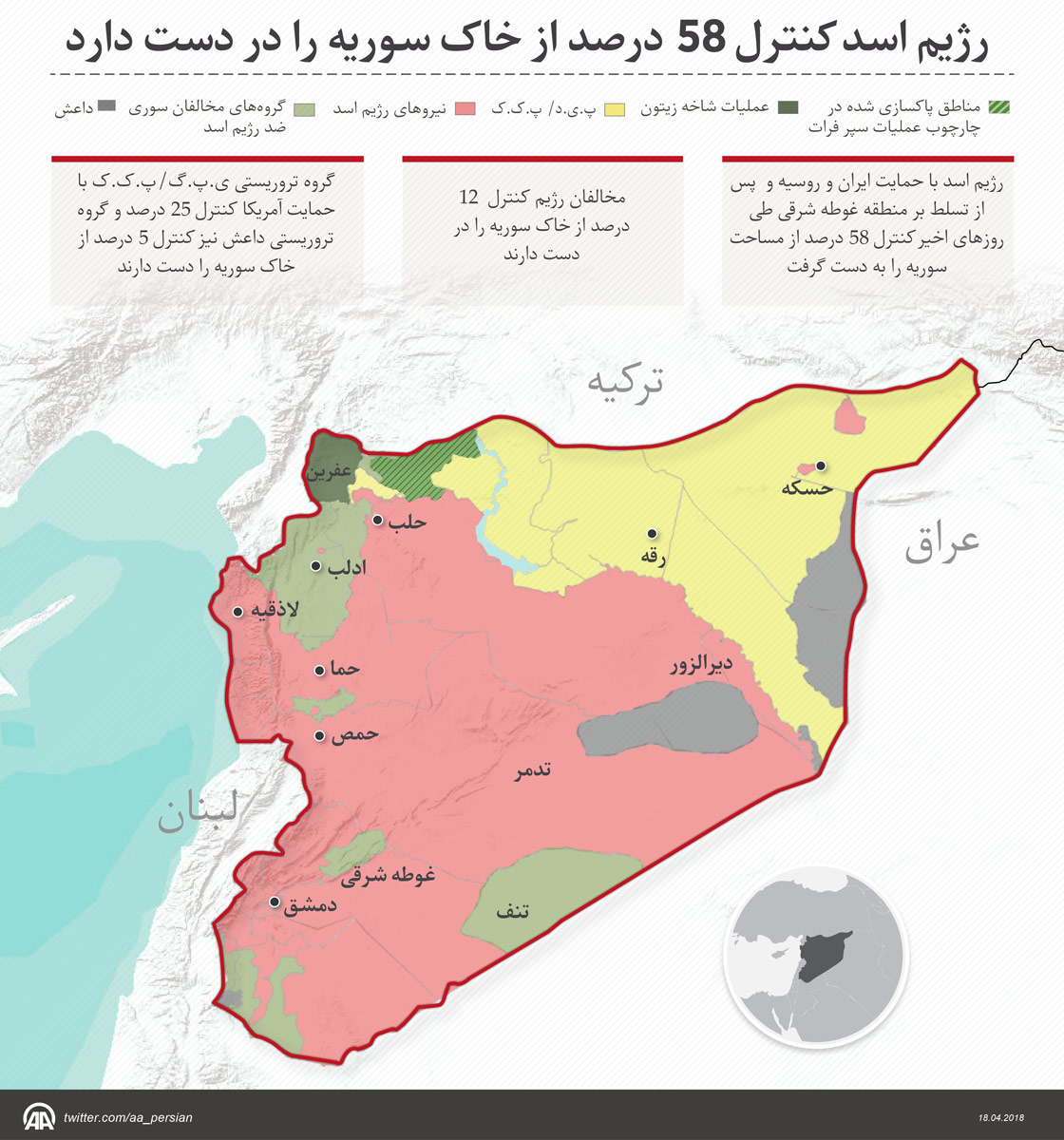 رژیم اسد با حمایت ایران و روسیه و پس از تسلط بر منطقه غوطه شرقی طی روزهای اخیر کنترل 58 درصد از مساحت سوریه را به دست گرفت.