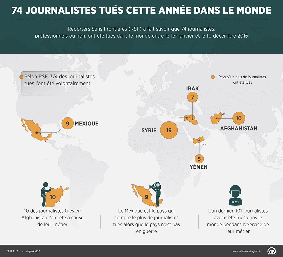 Reporters Sans Frontières (RSF) a fait savoir que 74 journalistes, professionnels ou non, ont été tués dans le monde entre le 1er janvier et le 10 décembre 201619 Décembre 2016•Mise à jour: 19 Décembre 2016