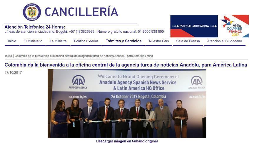 Le ministère colombien a indiqué dans son message : «Bienvenue dans notre pays», ajoutant que «Anadolu Agency est la plus importante agence de presse internationale en Turquie ».