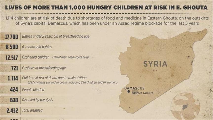 Sebanyak 1.114 anak terancam kematian akibat terbatasnya makanan dan obat-obatan di Ghouta Timur, daerah pinggiran Ibu Kota Suriah, Damaskus di tengah blokade yang dilakukan rezim Assad selama lebih dari 5 tahun, berdasarkan informasi yang dikumpulkan koresponden Anadolu Agency.