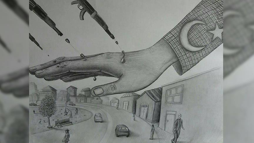 Rubaba Mohammedi, 16, sejak lahir tidak bisa menggunakan tangan dan kakinya, namun dapat membuat gambar yang melambangkan perlawanan rakyat Turki terhadap percobaan kudeta, dengan cara menggenggam pensil di antara giginya.