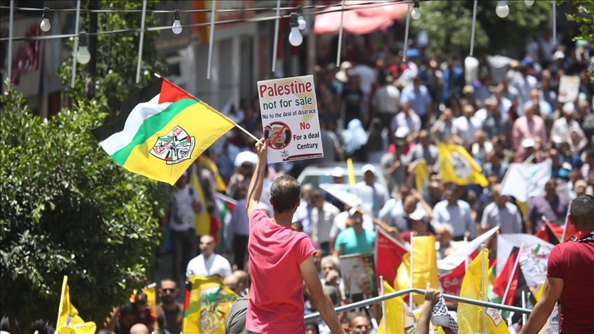 Ratusan warga Palestina berunjuk rasa di Ramallah, Tepi Barat, pada Senin untuk menentang "Kesepakatan Abad Ini" - sebuah rencana untuk mencapai penyelesaian damai antara Israel dan Palestina.